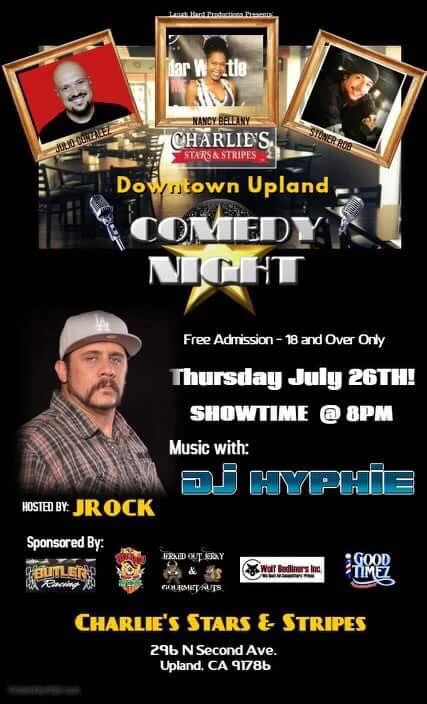 Comedy Night - Free Admission Thursday, July 26, 2018 8:00 PM 9:00 PM 20:00 21:00 Charlie's Stars & Stripes 296 N Second Ave. Upland, Ca 91786 (map) Google Calendar ICS