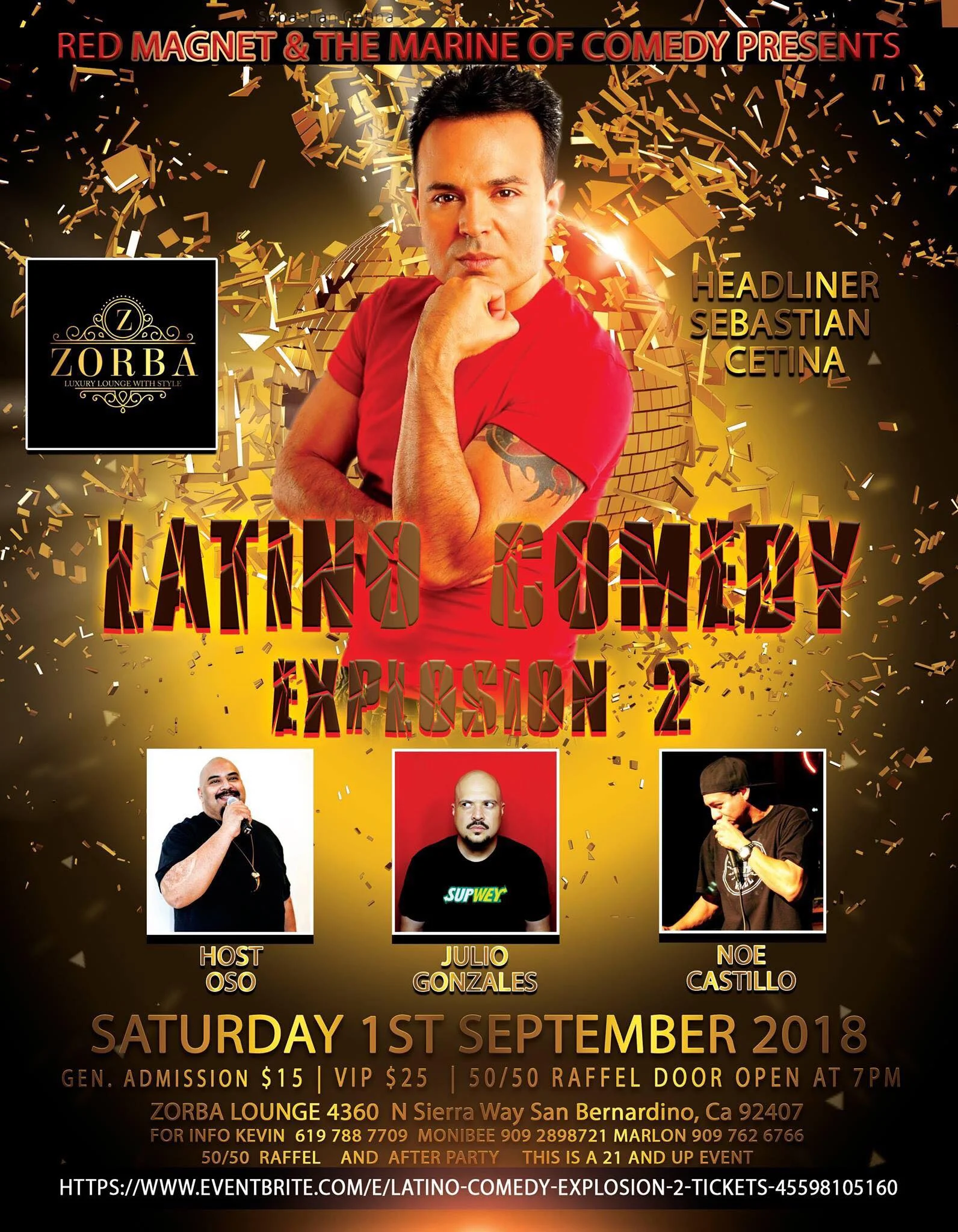 Latino Comedy - Explosion 2 Saturday, September 1, 2018 7:00 PM 10:00 PM 19:00 22:00 Zorba Lounge 4360 North Sierra Way San Bernardino, CA, 92407 United States (map) Google Calendar ICS